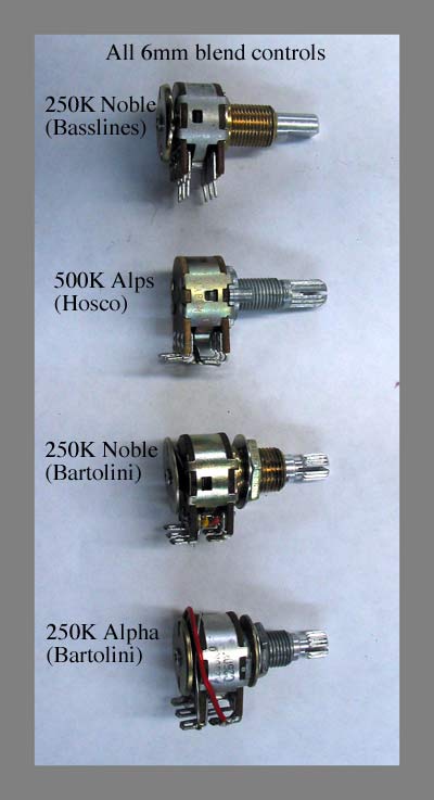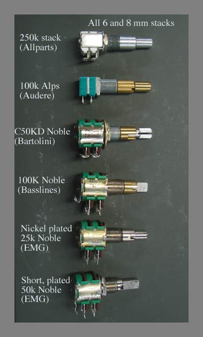 Bass players can choose among common active systems: Choose a system AGC 2 and 3 band (6 and 8mm solid tall shafts) Aguilar OBP 1, 2, & 3 (6mm split shaft, 6 and 8mm concentric) Alembic (1/4 inch solid shaft) Allparts EP4585 250K/500K concentric (3/16 inch and 17/64 solid shaft) Audere Audio JZ3, 3ZB, & Classic (6 and 8mm tall solid shafts, 1/4inch rotary switch) Bartolini H 2.4 through 5.4 A/P (6mm split and 8mm tall solid shafts) Carvin (6mm solid shaft, 3.5mm and 6mm solid shafts stacked concentric) EastPro U-Retro (6 and 8mm solid shafts) EMG BTC, BTS, BQC (6 and 8mm short solid shafts) Fender® Am. Elite & Deluxe. J (1/4 inch solid shafts, 3/16 and 1/4 stacked concentric) Fender® 1960, 61, 62, Flea J (3/16 and 17/64 inch stacked concentric) Glockenklang 2 and 3 band (6mm solid shaft, 4 and 6mm short stack) Graphtech Acoustic Midi with 3 band, sweep mid (3.5 and 6mm solid) Warwick MEC 2 and 3 band (6mm, 4 & 6mm short stacked) Noll 2, 3 and 4 band (4mm & 6mm short stacked) Nordstrand 2 and 3 band (6mm split and 8mm solid shafts) 3 band, 6mm and 8mm solid shafts short Peavey Cirrus, 6mm solid shafts Seymour Duncan BassLines STC2, STC3, MM3 (6 and 8mm solid, short)